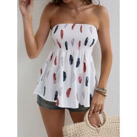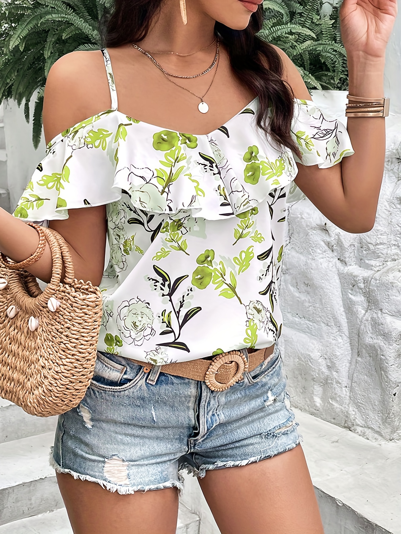 Boho Floral Print Spaghetti Blouse , Vacation Cold Shoulder Ruffle Trim Summer Tops , Women's Clothing