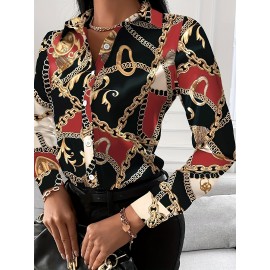 Cat & Stripe Print Button Front Blouse, Casual Notch Neck Long Sleeve Blouse For Spring & Fall, Women's Clothing