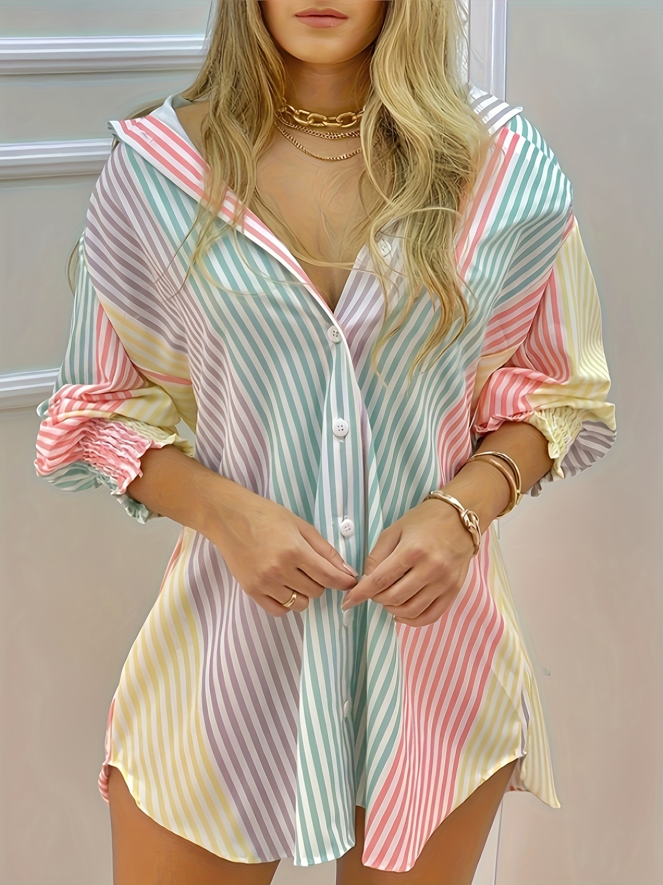 Colorful Striped Print Shirt, Elegant Button Front Collar Random Printing Shirt, Women's Clothing