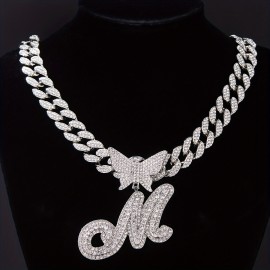 1pc Hip Hop Rhinester Italian Cursive Letters 26 Optional Butterfly Pendant , Men's Necklace, Street Hipster Full Faux Diamond Chain Link