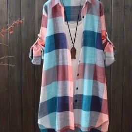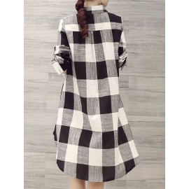 Plaid Print Dipped Hem Shirt, Casual Mid Length Button Front Turn Down Collar Long Sleeve Shirt, Women's Clothing