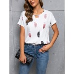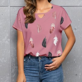 Feather Print Crew Neck Blouse, Casual Cut Out Short Sleeve Blouse For Spring & Summer, Women's Clothing