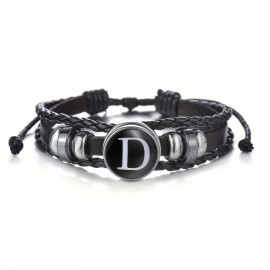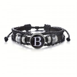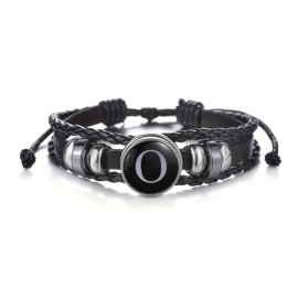 1pc 26 English Letters Black PU Leather Bracelet, Men's Vintage Punk Style Adjustable Rope Chain, Handmade Multilayer Beaded Bracelet Jewelry