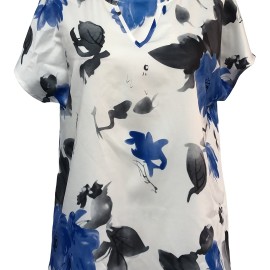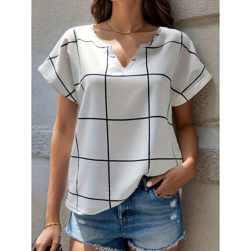 Plaid Notched Neck Blouse, Casual Short Sleeve Blouse For Spring & Summer, Women's Clothing