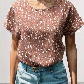Crew Neck Floral Print Blouse, Casual Short Sleeve Blouse For Spring & Summer, Women's Clothing