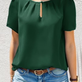 Solid Color Crew Neck Keyhole Blouse, Casual Short Sleeve Blouse For Spring & Summer, Women's Clothing